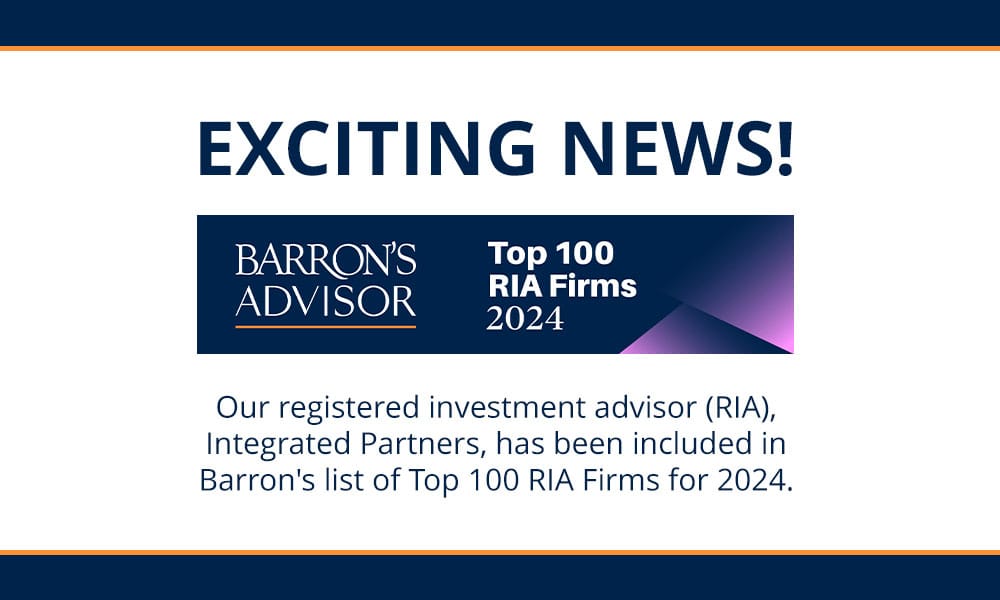 We are excited to share that our registered investment advisor (RIA), Integrated Partners, has been included in Barron’s list of Top 100 RIA Firms for 2024.